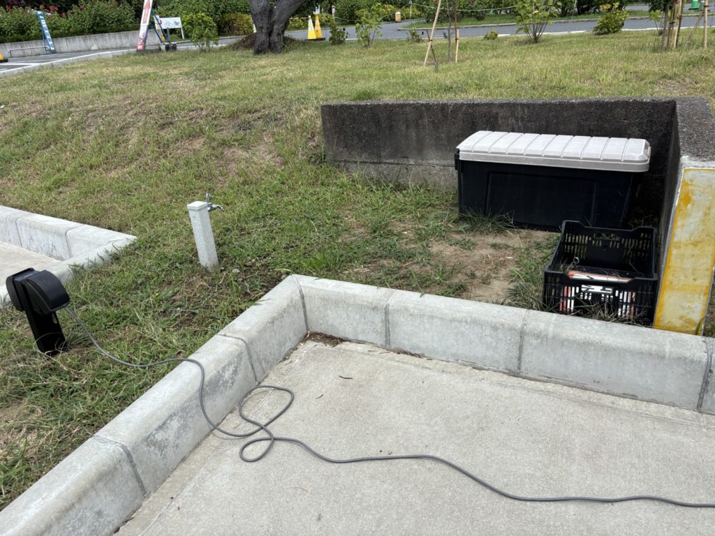 専用水道の蛇口はあるが排水溝はないので、洗い物などができるわけでない。チェックアウトの際に何かを返却するわけではないので、ゴミを指定の袋に入れて、エリア内にある収納BOXに入れて、三角コーンとバーでスペースを塞いで出庫すればOK。