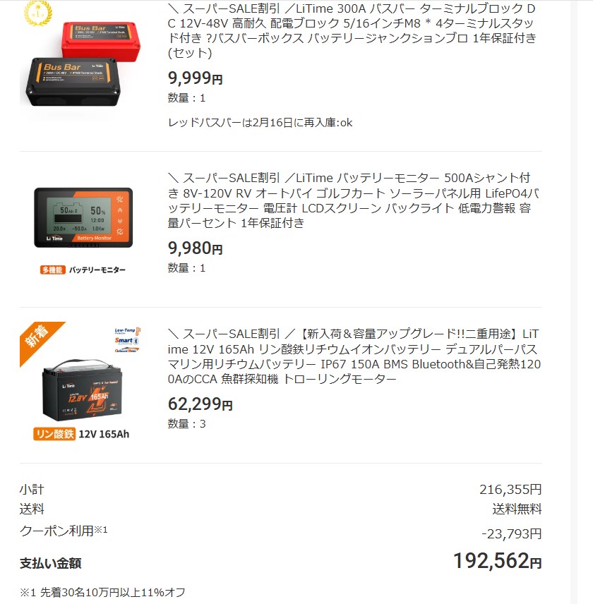 52%引き 複数割引等々で12V165A 3つの合計が181,702円になってます。